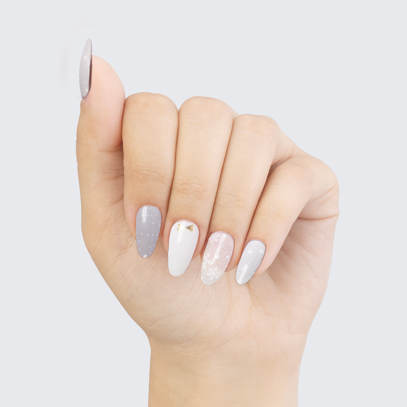 Translucent base. White snowflake detailing with white & silver polka dots. Neutral undertone.